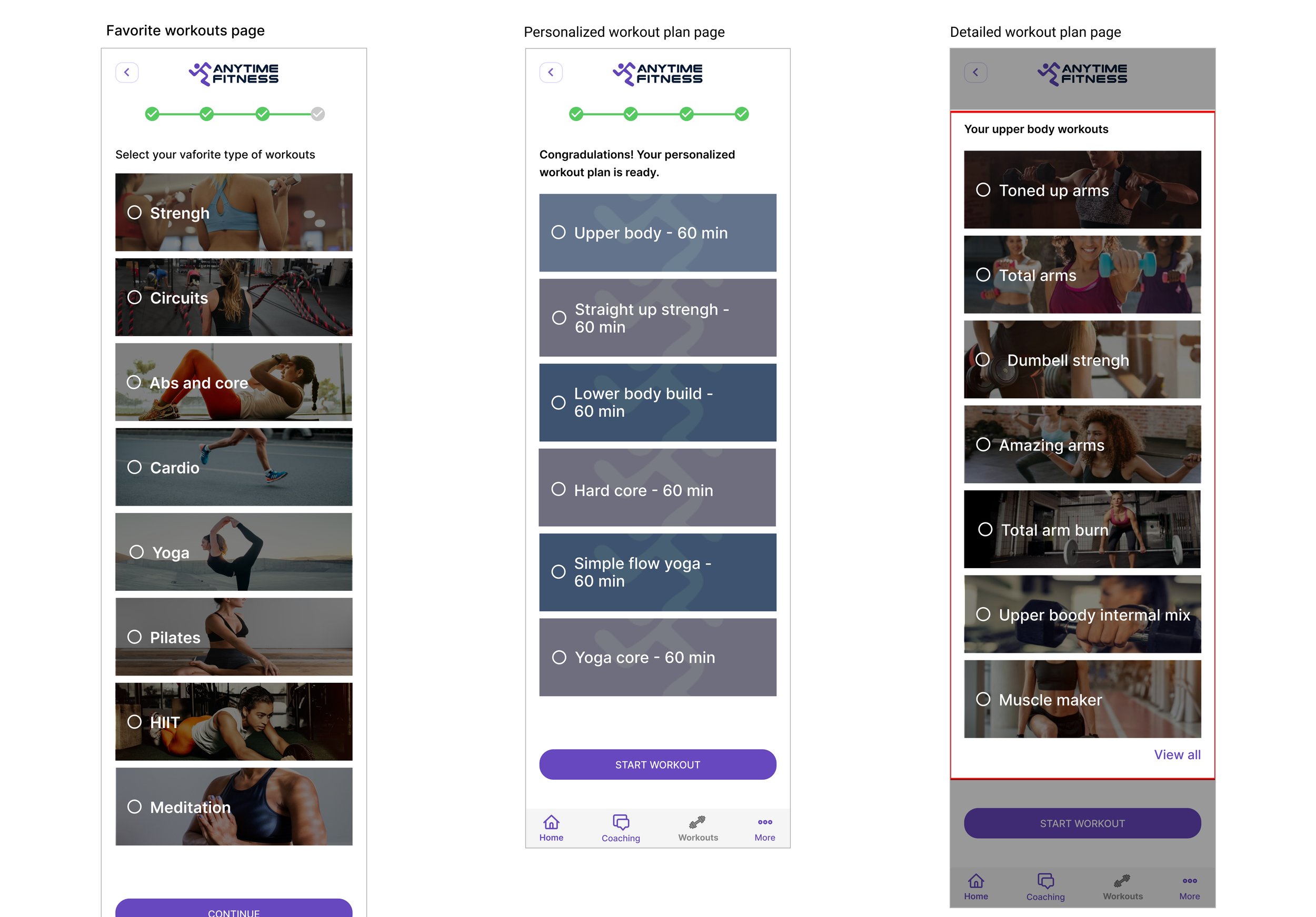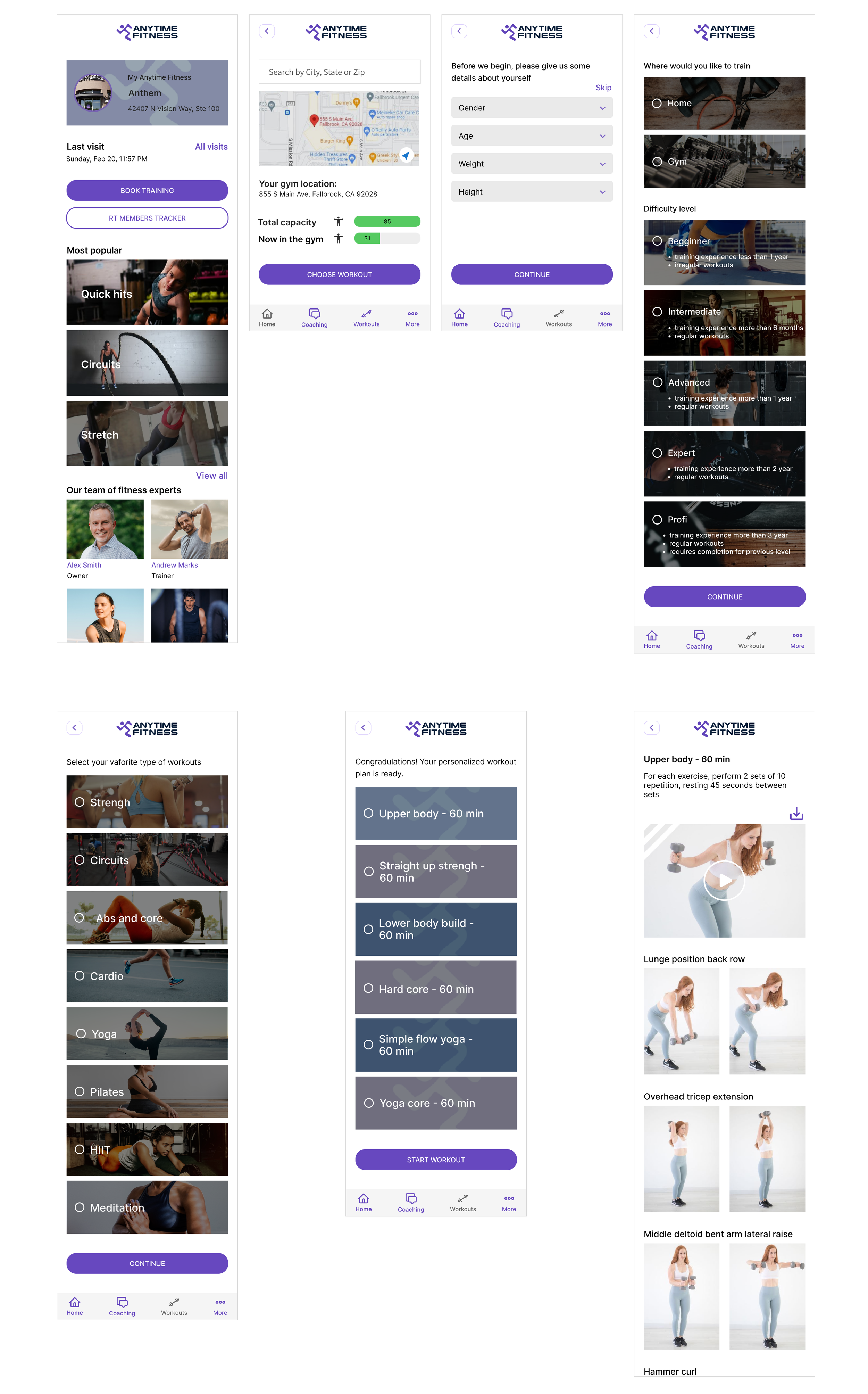 Using the Anytime Fitness UI Kit, I completed high-fidelity wireframes. I created the original Anytime Fitness screens leading up to the new feature and the feature screens. It is important for the users to track how many people are in the gym in real-time to choose the most convenient time for their workouts. Also, using a personalized workout plan would help determine the most appropriate activity for users.