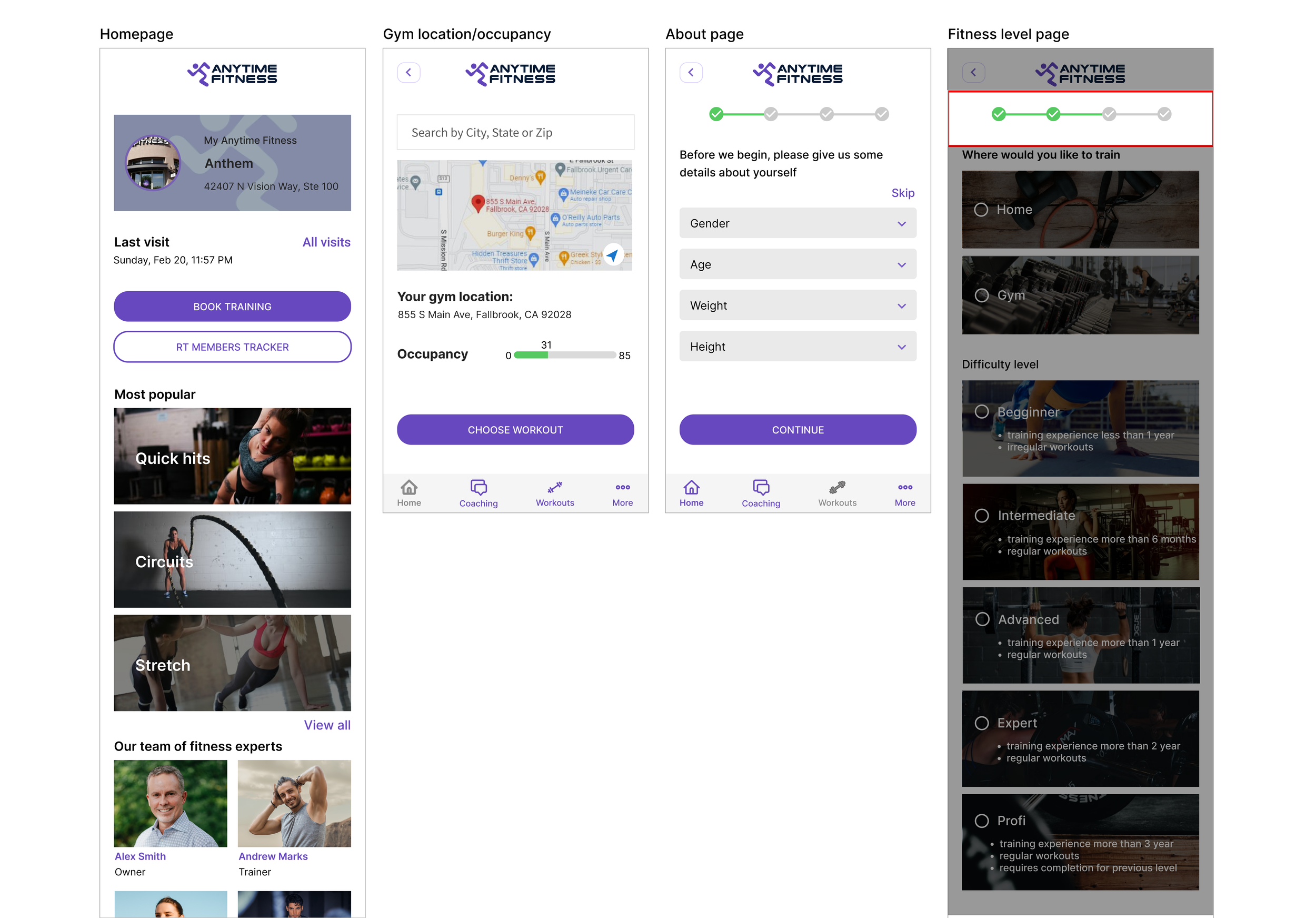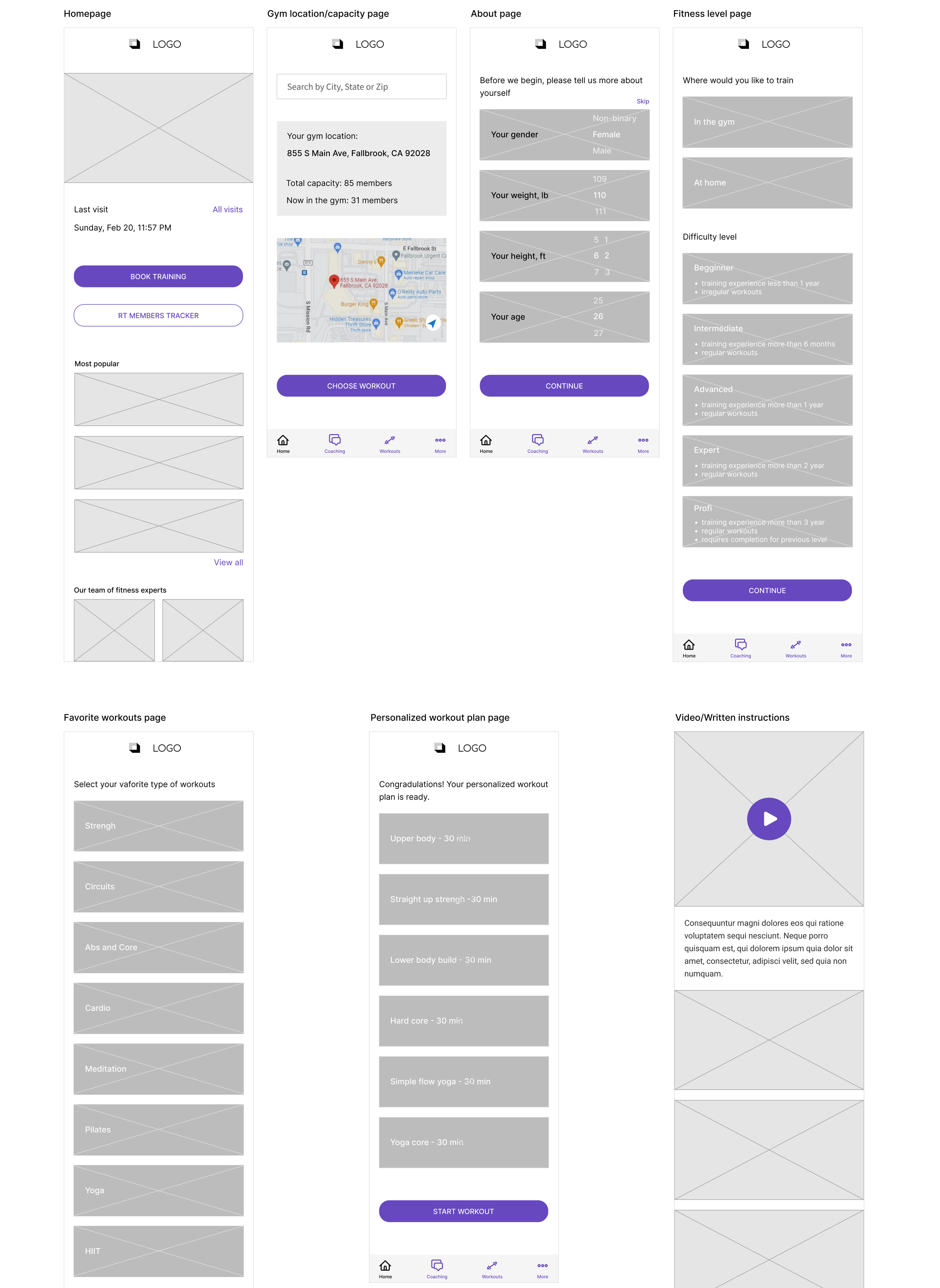 I started this process by creating the frames already built in the app. Then I had to find the optimal location to place the feature to fit seamlessly within the original design. I needed to design the home screen, gym location, about the user page, fitness level page, favorite workouts, personalized workouts, and video and written workouts page. Once this was completed, I was able to start on the new feature. The optimal location for the real-time member tracker was on the gym location page. Users could easily track the location and the gym capacity on the same page.