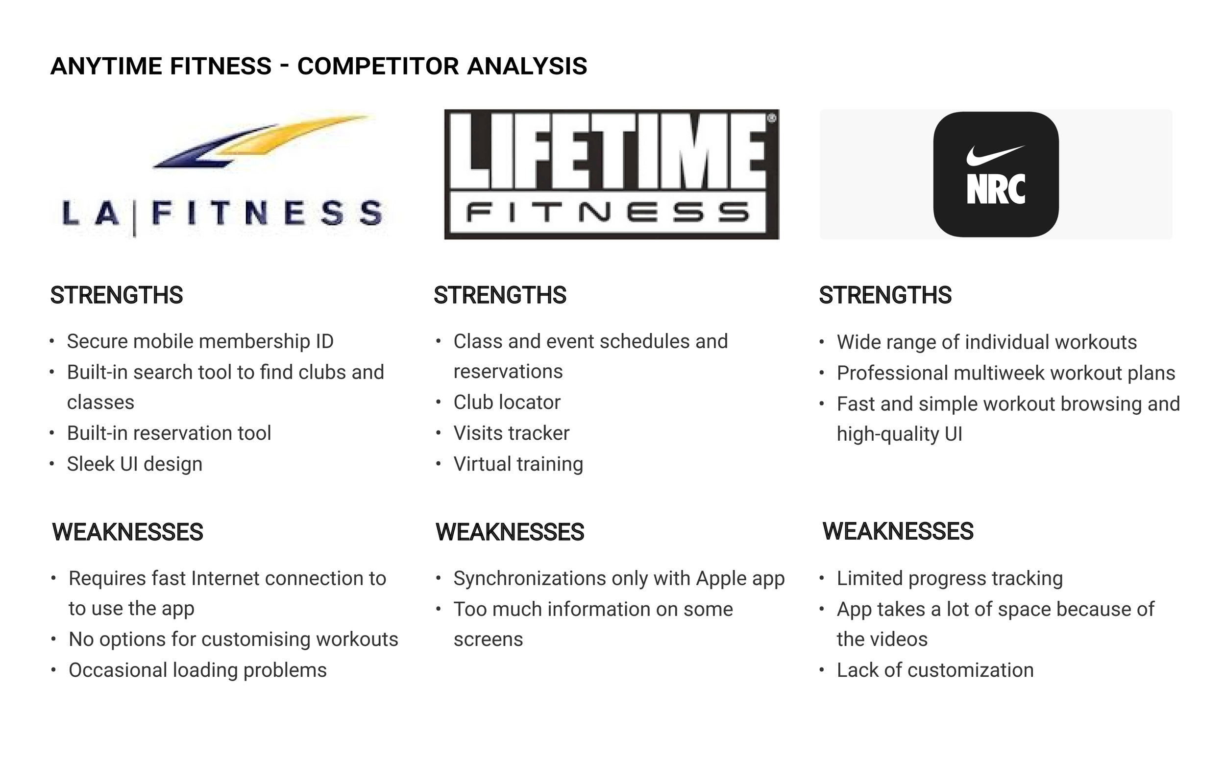Competitive Analysis. The following competitors were analyzed for the secondary research: LA Fitness, Lifetime Fitness, and NRC.