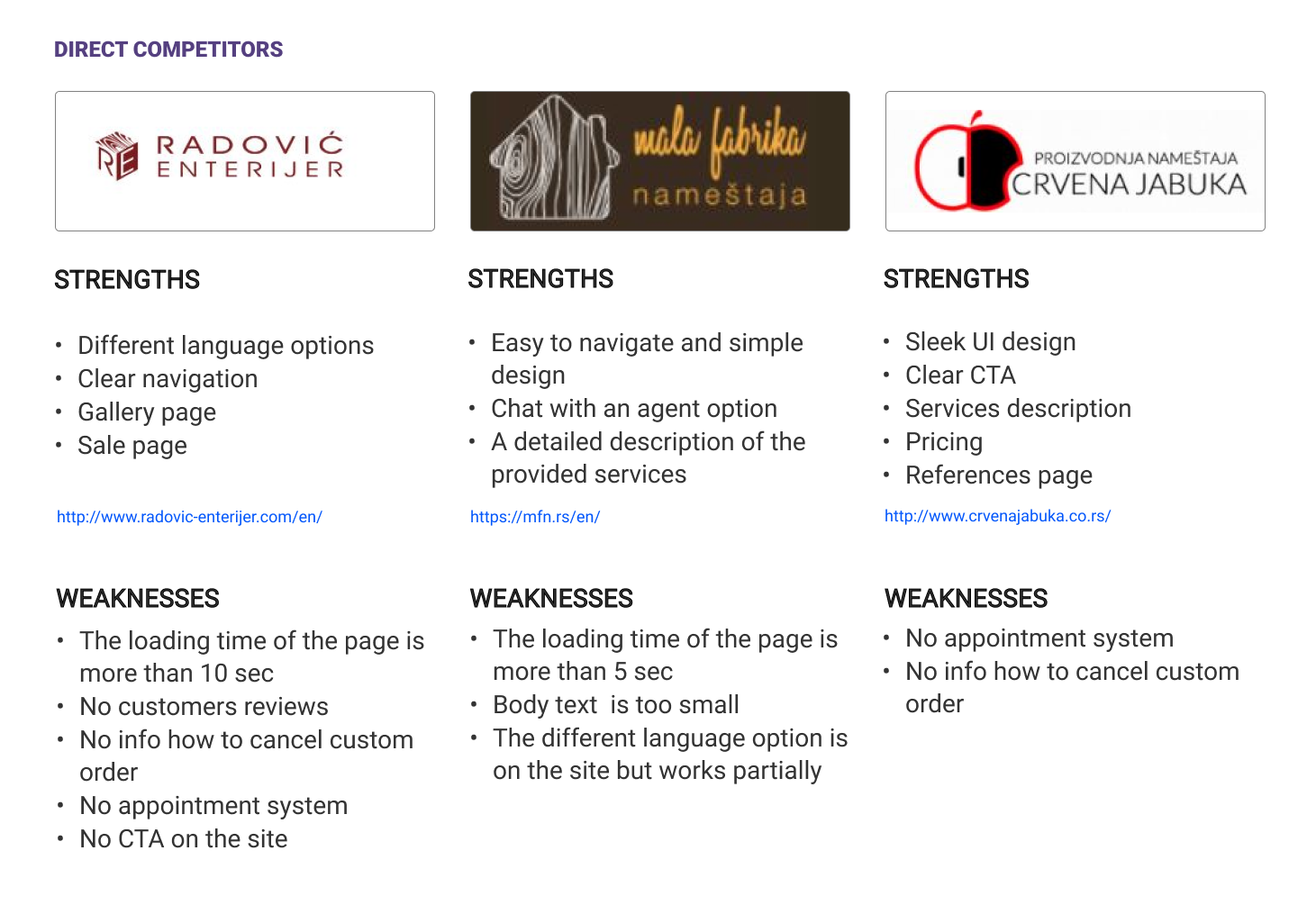 Competitive Analysis. I conducted a competitive analysis to understand the biggest competitors for the ID Concept and their strengths and weaknesses. The biggest competitors for ID Concept are Radovic Enterijer, Mala Fabrika Namestaja, and Crvena Jabuka namestaj. They target the same market and offer similar services and materials. Based on the type of product, the furniture manufacturing market in Serbia can be segmented into the following: office furniture; kitchen furniture; Mattresses, and other furniture