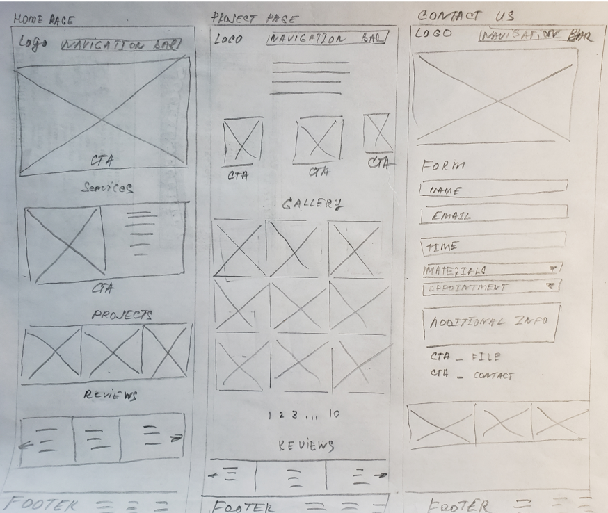 Sketching. After identifying the key pages, I spent some time developing sketches. I translated my sketches into low-fidelity wireframes.