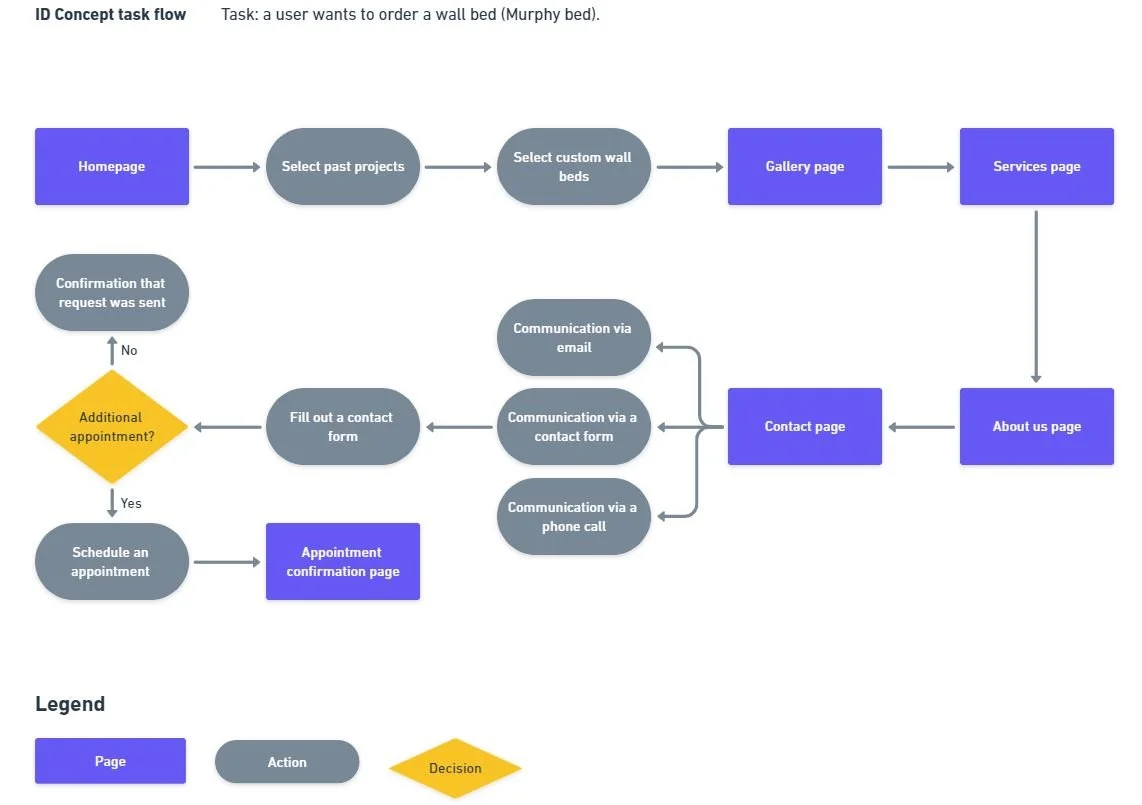 After conducting research, I started the Define stage by developing a primary task flow. Task: a user arrives on the home page and orders a wall bed (Murphy bed).