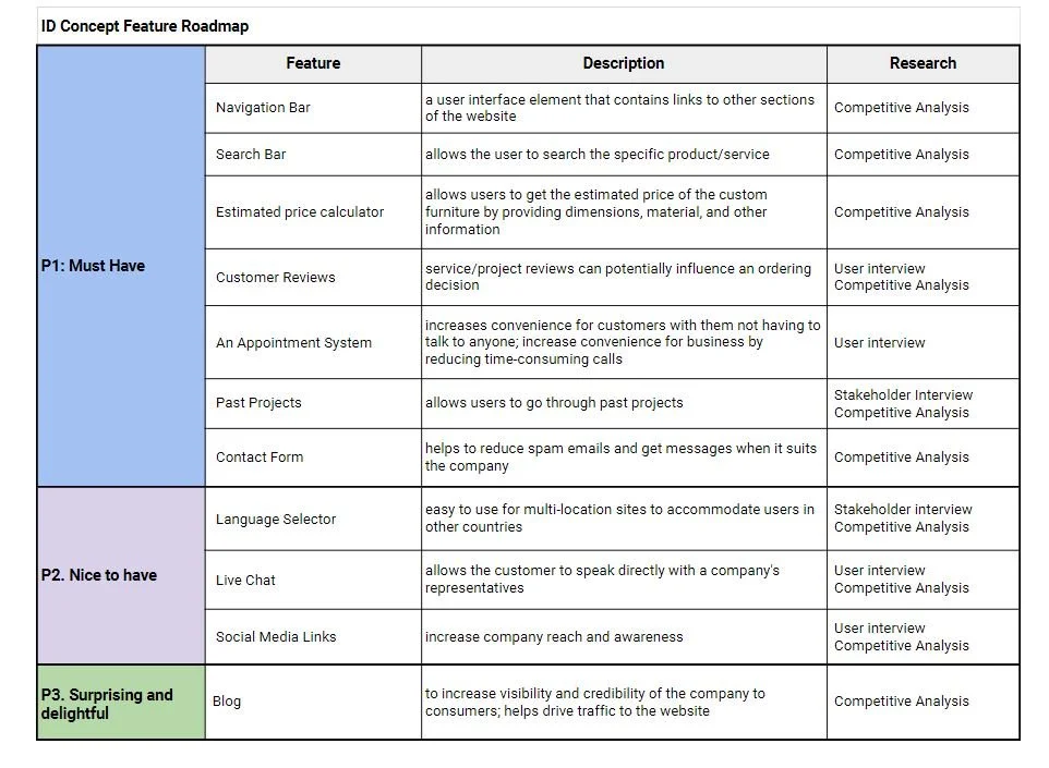Feature roadmap. I created a feature roadmap based on my user research findings, the participant's needs, my persona, and competitive analysis