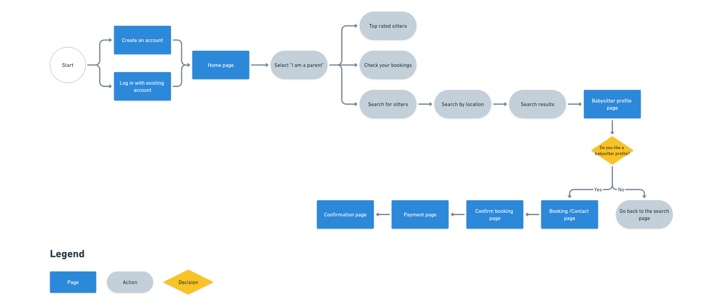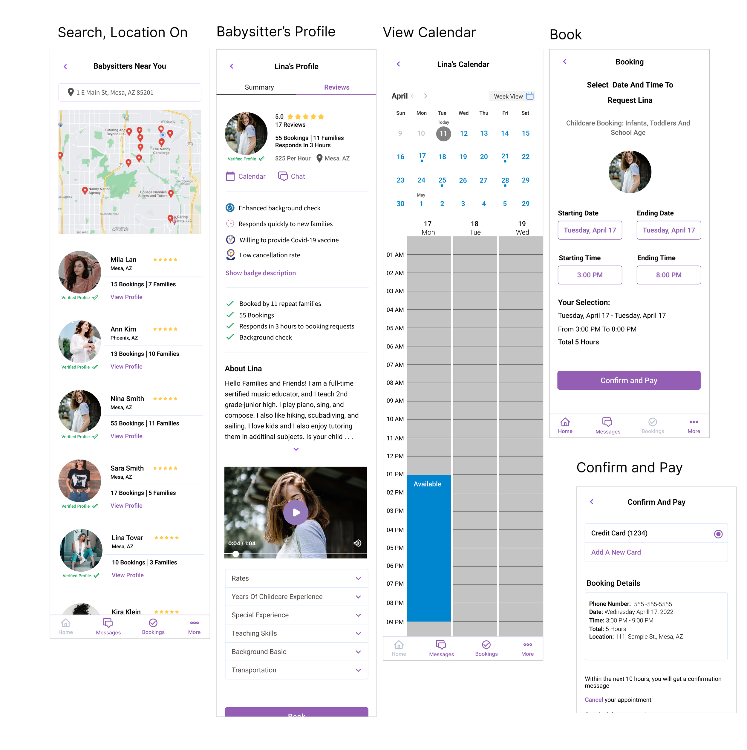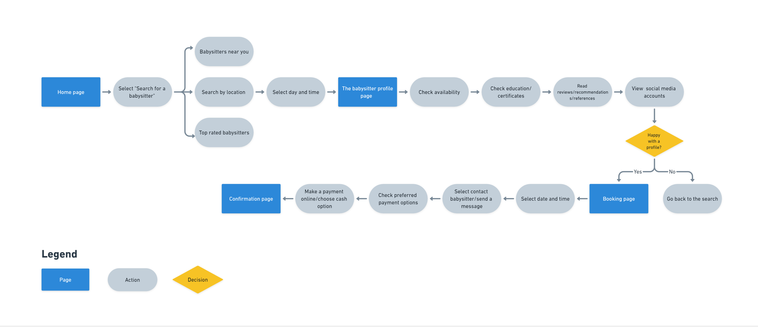 After gathering research and defining the MVP, I began working on the main task flows. The main goal is to find a reliable babysitter. I wanted to make it convenient for users to find a babysitter and pay for services online