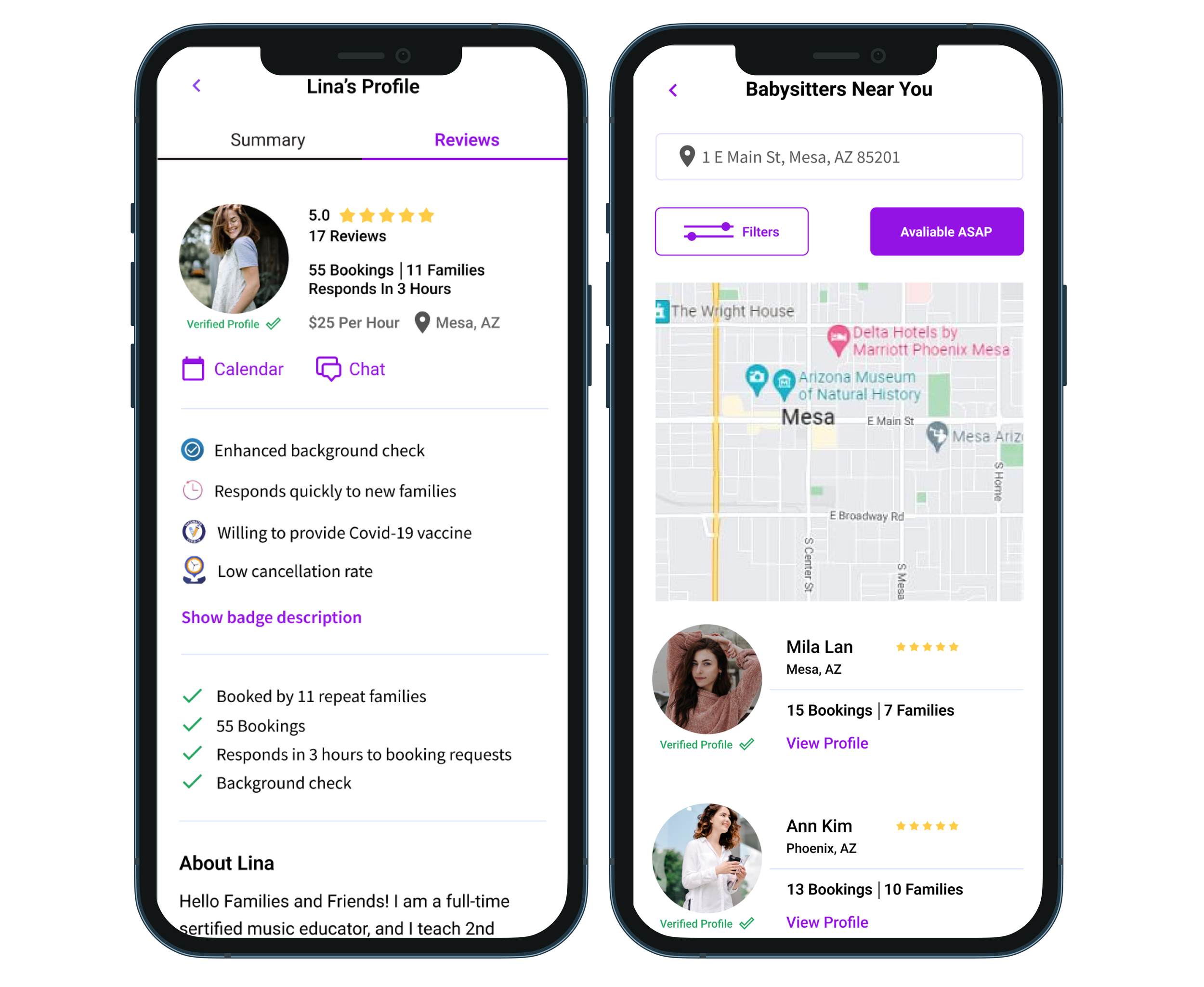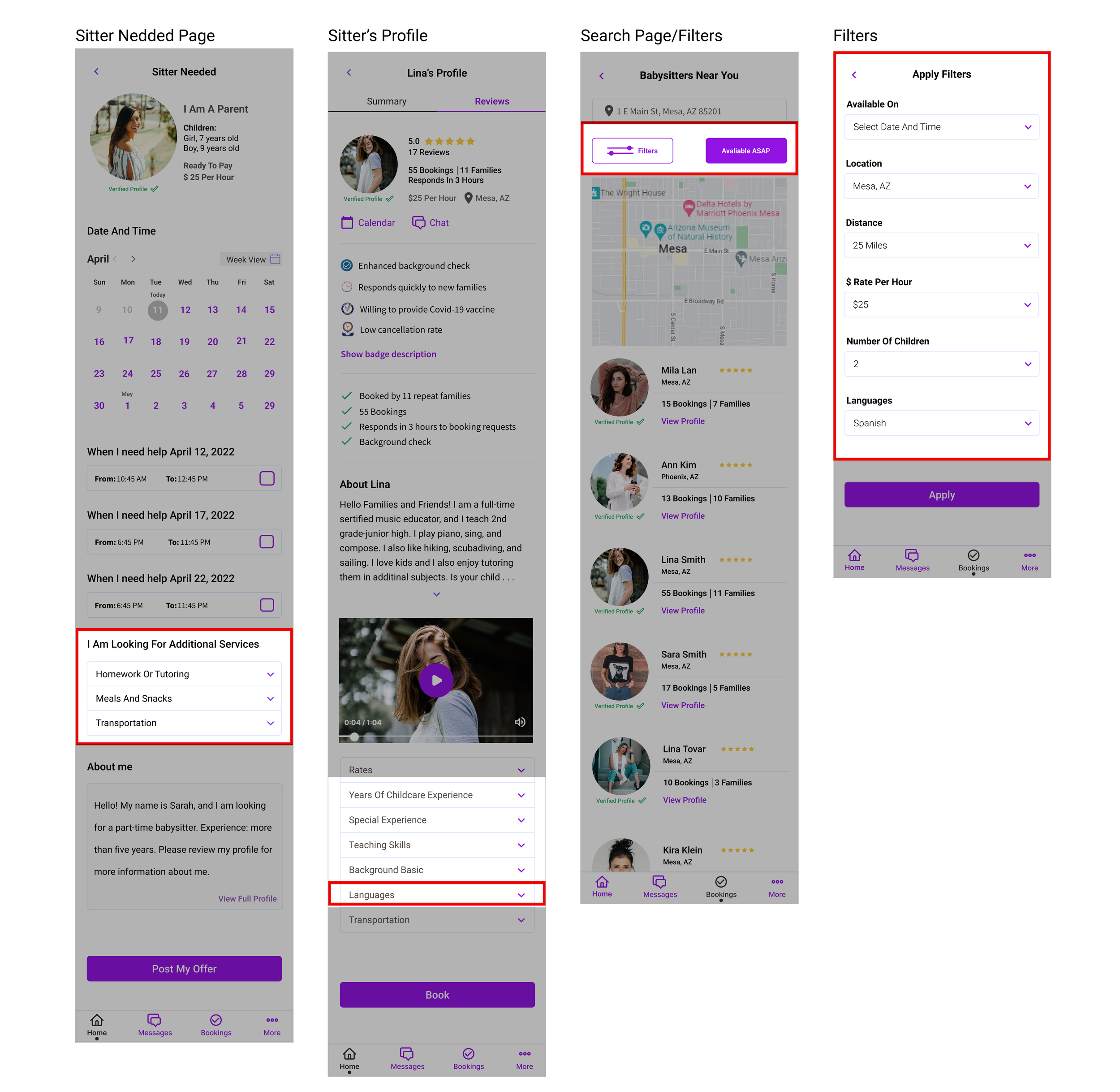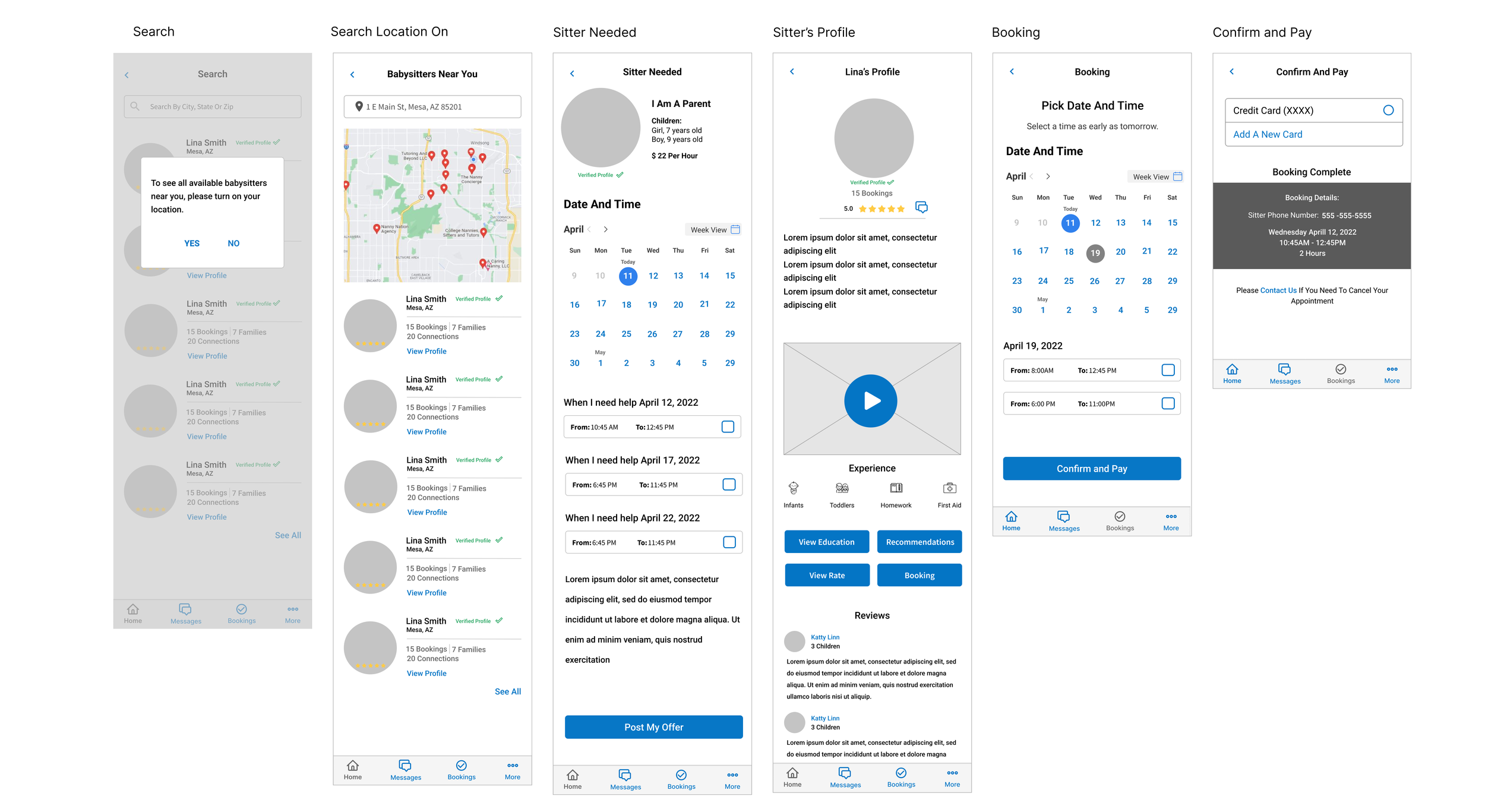 After gathering research and defining the MVP, I began working on the main task flows. The main goal is to find a reliable babysitter. I wanted to make it convenient for users to find a babysitter and pay for services online