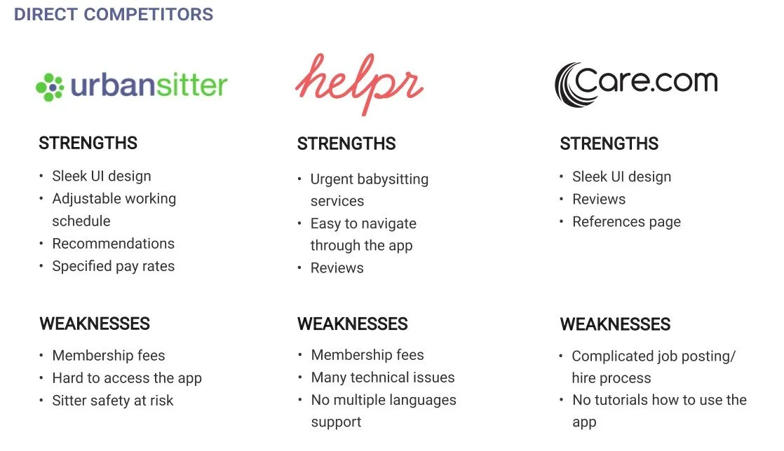 Secondary research. I analyzed the following competitors for the secondary research: Urbansitter, Helpr, Care.com