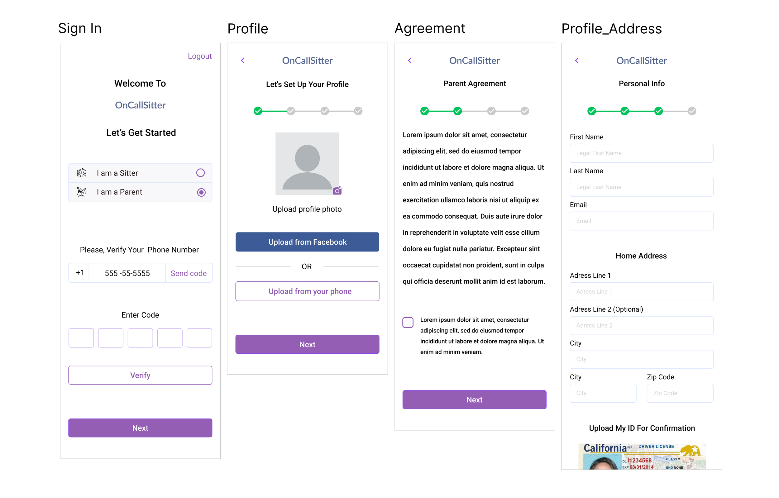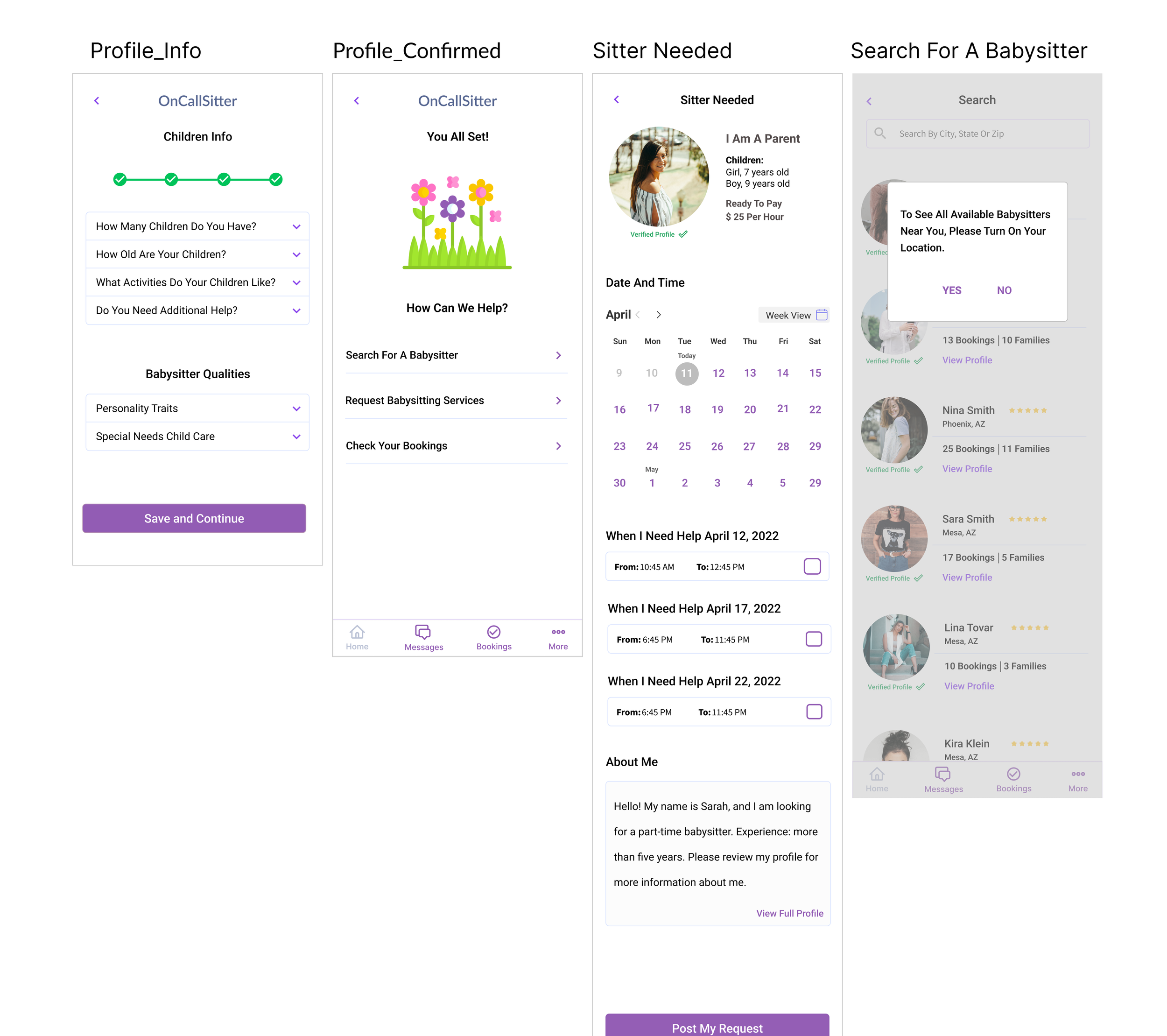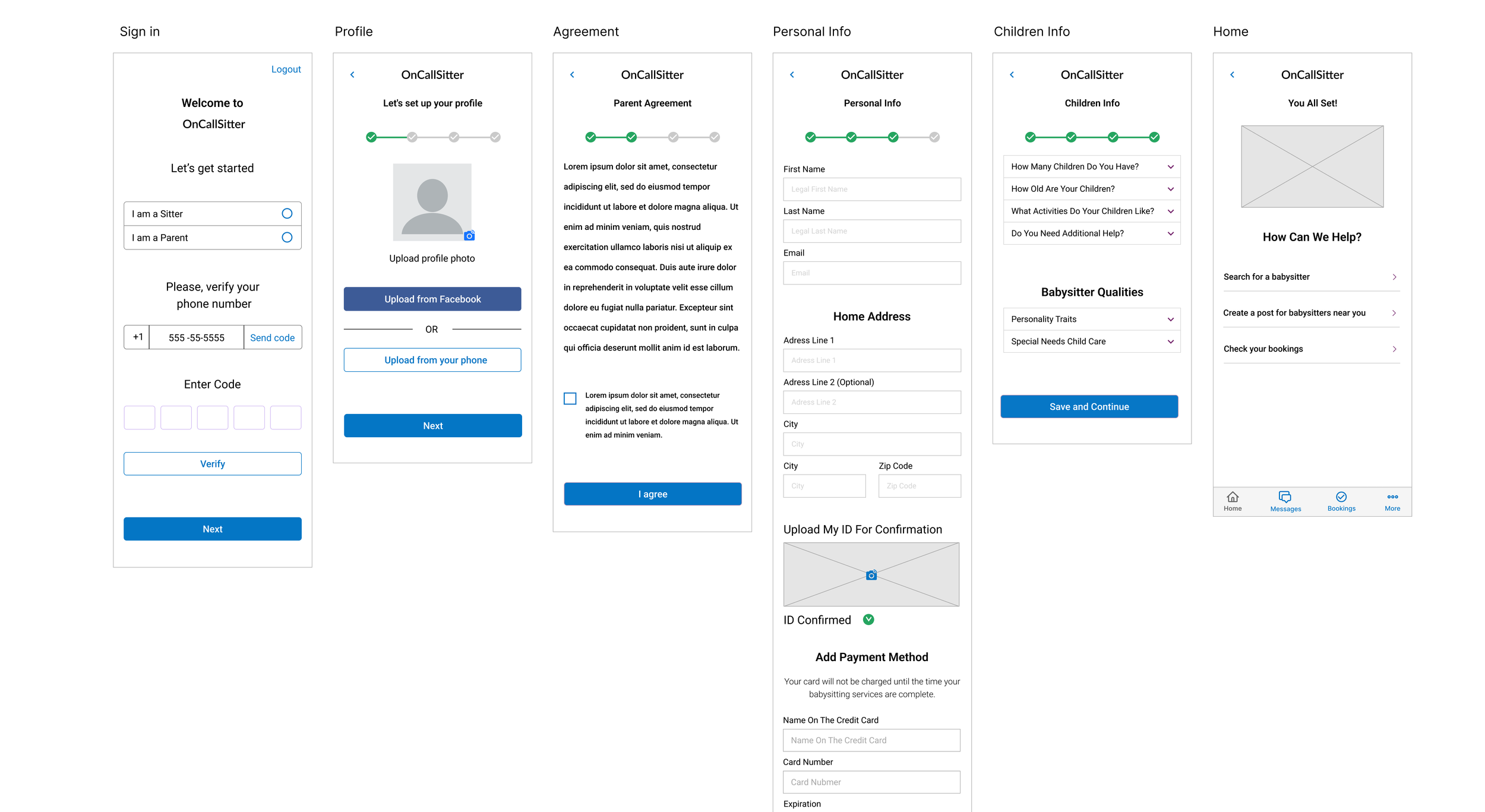 Through multiple iterations of sketches, I was finally able to create my low-fidelity wireframes. It was essential to provide a simple process to search, select and pay for a sitter. OnCallSitter also had to provide an easy way for a parent to learn about each potential sitter. The wireframes for the OnCallSitter app include a summary of qualifications and a streamed short video biography of each sitter designed to give a parent the most important details about the person they would trust the most important in their life - children