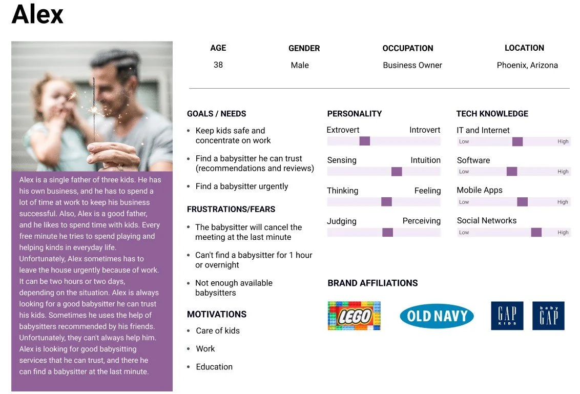 User Persona. Based on my research, I created a user persona - Alex. Alex represents parents' goals and fears while looking for a babysitter.